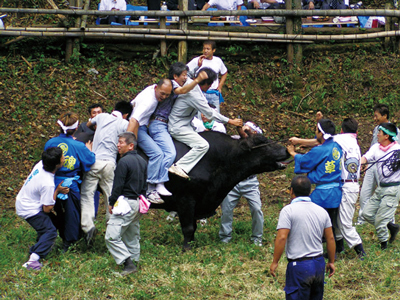 八朔牛突き大会は、午後1時に土俵入りが始まり、午後3時30分頃まで続く。かつては農耕用に牛を飼う家が多く、取組も20番くらいまであったそうだ。今では農業の機械化で牛も減り、7、8番くらいになった。それだけに1頭の牛に懸ける想いが熱いのも確か。大会に牛を出すために、飼い主をはじめ、家族や親戚が一丸となる。