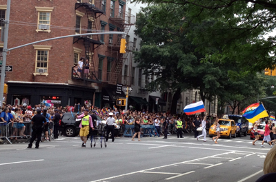 このこともあって、ニューヨークで6月30日に行なわれた恒例の「LGBT(レズビアン・ゲイ・バイセクシュアル・トランスジェンダー)プライド・フェスティバル)」は祝賀ムードで盛り上がった。ロシアや旧ソ連諸国からも、かなりのLGBT支援者が参加していた(写真参照)。このようなパレードやイベントは、ニューヨークが発祥だが、現在、同時に世界各地で行なわれている。ロシアでもモスクワやサンクトペテルブルグなどで行なわれたが、当局に弾圧され、流血の惨事となった。
