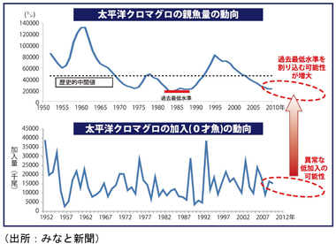 不思議に思えるかも知れませんが、2015年から15%の削減が適用となっても、漁に大きな影響はないとの見方が大半です。日本の上限は6,800トンとなりますが、2010~2012年の平均漁獲量は6,100トンです。2010年を起点として過去15年間で、産卵が可能なクロマグロは1/3以下に減少していると言われており(図)、漁獲が近年より多かった2002~2004年の数字からの15%の減少なので、管理をして減らしてきたというより、単に獲れなくなってきたというのが実情かと思えます。