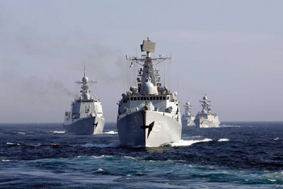 ウラジオストク沖で行われた中露軍事演習に参加するため日本海を航行する中国人民解放軍艦艇 (提供:AP/アフロ)