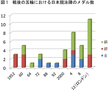 確かに五輪における、水泳(競泳)のメダル数は2000年以降、増加傾向にある(図1)。昨年のロンドン五輪は戦後最多のメダル数11個を獲得した。今年8月の世界選手権では、メダル6個と寂しかったが、男子400メートル個人メドレーでは瀬戸大也(早大)が金メダル、萩野公介(東洋大)の400メートル自由形と200メートル個人メドレーの2個の銀メダルを獲得するなど若手が活躍し、「この先、楽しみな結果」と言えるだろう。
