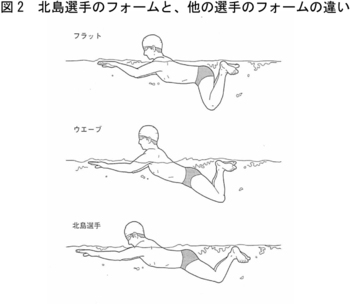『泳ぐことの科学』(吉村豊、小菅達男著、NHKブックス)によれば、北島のすごさは、最も抵抗が小さくなるストリームライン(手足を一直線に伸ばした流線形)の美しさと、その持続時間の長さにある。その姿勢を維持するために推進力も確保しなくてはならない。
