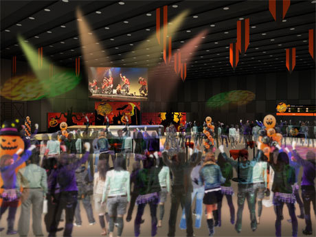 場内は中世・ヨーロッパの墓地をイメージさせるステージ装飾を施し、ジャックランタンやゾンビメークを施すなど仮想したスタッフがサービスを行う。当日はテーブルを配し、スタンディングで420席を用意。場内には、9月に香川・小豆島で開催された「日本一どでカボチャ大会」で日本一に輝いた重さ485キロのカボチャで作るジャックランタンも展示する。