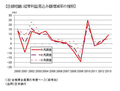 日銀短観をみても、企業(全規模全産業)の2013年度経常利益は前年度比9.2%増の見込みとなっている(図表7)。しかも、前回の短観発表からは上方修正されている。とりわけ、製造業大企業の2013年度経常利益増加見込みは大きく、前年度比でプラス24%にも達する。企業の収益増がトレードオフ状態の雇用と賃金の両方を今年度拡大に転じさせる可能性は十分にある。