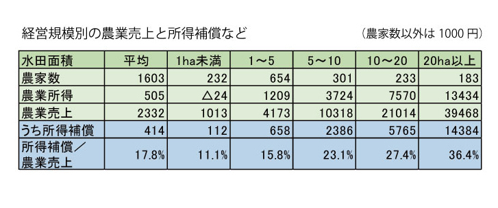 表は、農業の売上のうち、政府の補助金について農家の水田面積ごとに示したものである。表を見ると、面積が大きくなるほど所得補償額が大きくなっている。例えば、1ヘクタール未満では11.2万円の受取に過ぎないが、20ヘクタール以上では1438.4万円にもなっている。しかも、売上に占める所得補償の比率も、1ヘクタール未満では11.1%であるが、20ヘクタール以上では36.4%になっている。大きな農家ほどより高い比率で所得補償を得ているのである。