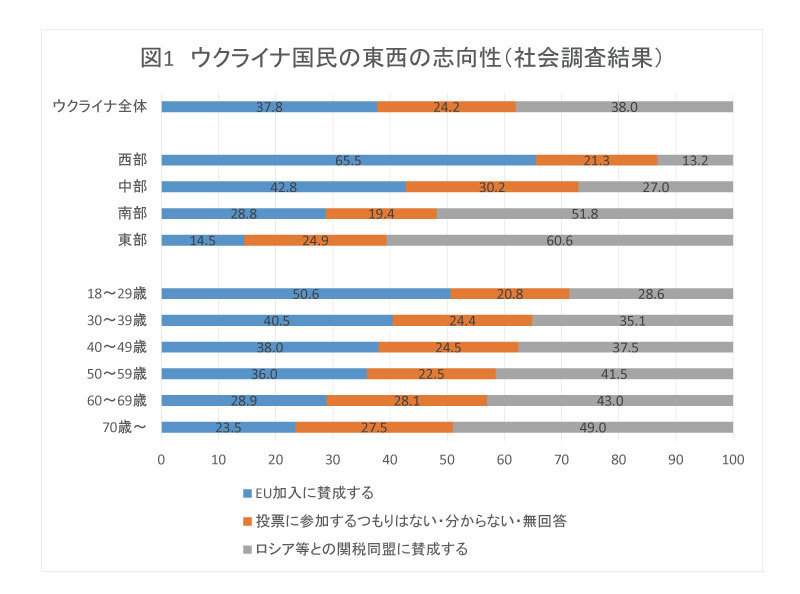 図1を観ると、歴史的背景もあり、ウクライナの西部・中部は親EU、南部・東部は親ロシアで、また若い人は親EU、高年齢層は親ロシアの傾向が強いことが分かる。