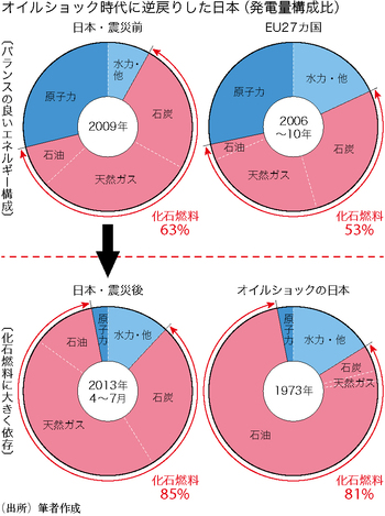 震災後の原発停止で、日本のエネルギー構造は、オイルショックの頃に戻ってしまった。脱石油、脱中東を目指した、この40年間の「多様性」への投資は水泡に帰した。脱原発の切り札と目される、米国のシェールガス、再生可能エネルギー、電力自由化は、欧米の現状を直視すればいずれもあてにならない。政権が一歩踏み込んで、エネルギー供給と市場の将来像を示さなければ、次なるオイルショックは防げない。