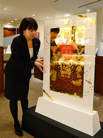 「ピースをつなぎ合わせるとバラバラだったディズニーのキャラクターが集合する。カレンダーでありながらパズルの要素を含んだ、遊び心あふれる逸品に仕上がっている」と同店の藤本正江店長。「短い展示期間だが、金のキラキラとした輝きをじかに見ていただき、皆さまの一年がキラキラしたハッピーなものなれば」