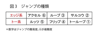 幅跳びの踏み切りは、靴と地面の摩擦がブレーキの引き金となるが、フィギュアスケートでは、どうだろうか。普通に滑っているときにどんな一流選手でもブレーキはかけられない。そこで、踏み切り直前に、(1)スケートの刃(ブレード)を滑走方向と交差するように横向き(図2)にする(2)ブレードのつま先(トー)にあるピック(ギザギザの部分)を氷に立てる――。この2通りの方法で、ブレーキをかけるのである。ブレードを横向きにしてエッジ(端)でブレーキをかける(1)のタイプを「エッジ系」と、トーピックでブレーキをかける(2)のタイプを「トー系」のジャンプと呼んでいる。のちに詳しく説明するが、浅田の得意とするトリプルアクセルは、エッジ系である。