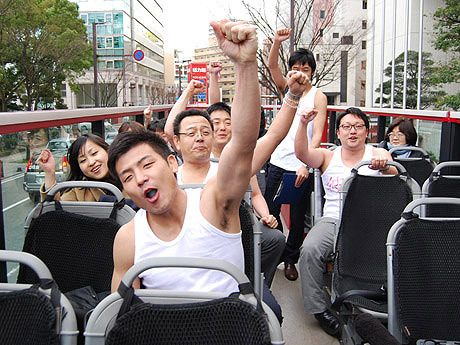 屋根なしバスで我慢大会「タンクトップ祭り」-企画した社員らが体験