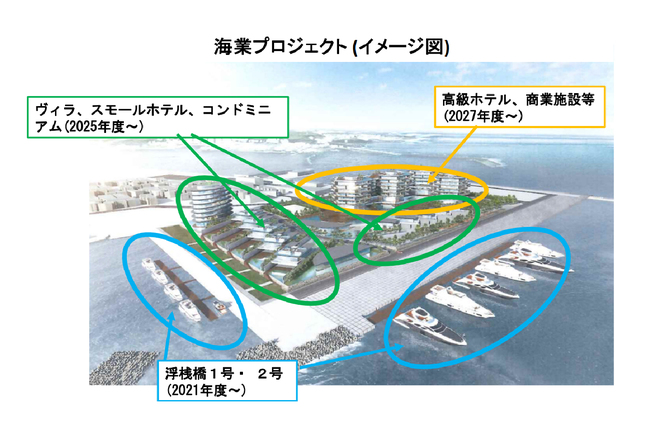 この大規模高級リゾート整備計画は政府により国家戦略特区に位置付けて進めることが決定され、21年3月の東京圏国家戦略特別区域会議に提出された資料によると、同年から開始した第一段階では浮桟橋設置、「インフラ整備」「マーケティング」による地域の価値向上イベント開催、仮建屋建築、第二段階として25年からヴィラ5~8棟、スモールホテル50室程度の建設、第三段階として27年からパブリックホテルの建設を目指すとされている。