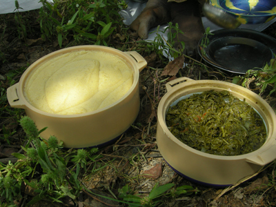 とうもろこしの粉で作ったトー(左)と葉っぱのソース
