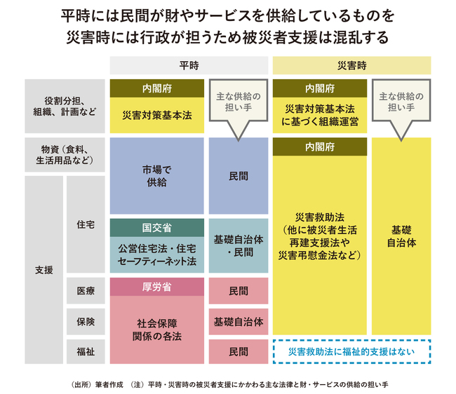 これらは一例だが、今後は災害対応を「官民連携」から「官民協働」へと昇華させていかなければならない。災害法制の見直しはもちろん、政府や自治体が平時から民間組織と役割分担を決め、協定などを締結しておくことも必要になる。当然、「公的な根拠」に基づく業務であるため、公的な財源で賄い、「餅は餅屋」の災害対応を目指すべきだ。