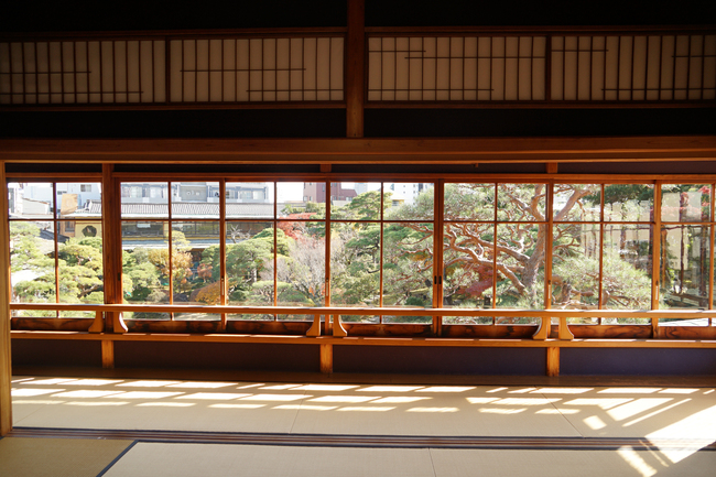 部屋を囲む三方には広い畳廊下が回されて、外に向けて全面、ガラス戸張りとなっている。廊下の天井は斜めに切られ、梁に20メートルはあろうかという一本丸太が使われている。ガラス戸の先にかつては海が見えたというから、その開放感は格別だったに違いない。