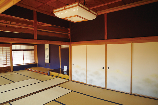 玄関に近い和館2階の「大鳳の間」は、10畳と8畳の二間続き。長押を2段にして天井を高く上げているので、部屋は広々と感じられる。欄間と床の間の壁が紫に彩色され、和室にしてはモダンな印象を残すものの、床脇の障子窓に細竹を使うなど、部材は高価なものを揃えている。