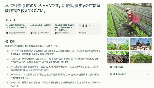 また、新規就農を希望しているサラリーマンが就農するための方法をPerplexityで聞くと、いくつかの効果的な新規就農指導のアプローチを提案するなどの回答とともに参考文献も示してくれる。回答に関する疑問点は文献に直接当たることも可能だ。