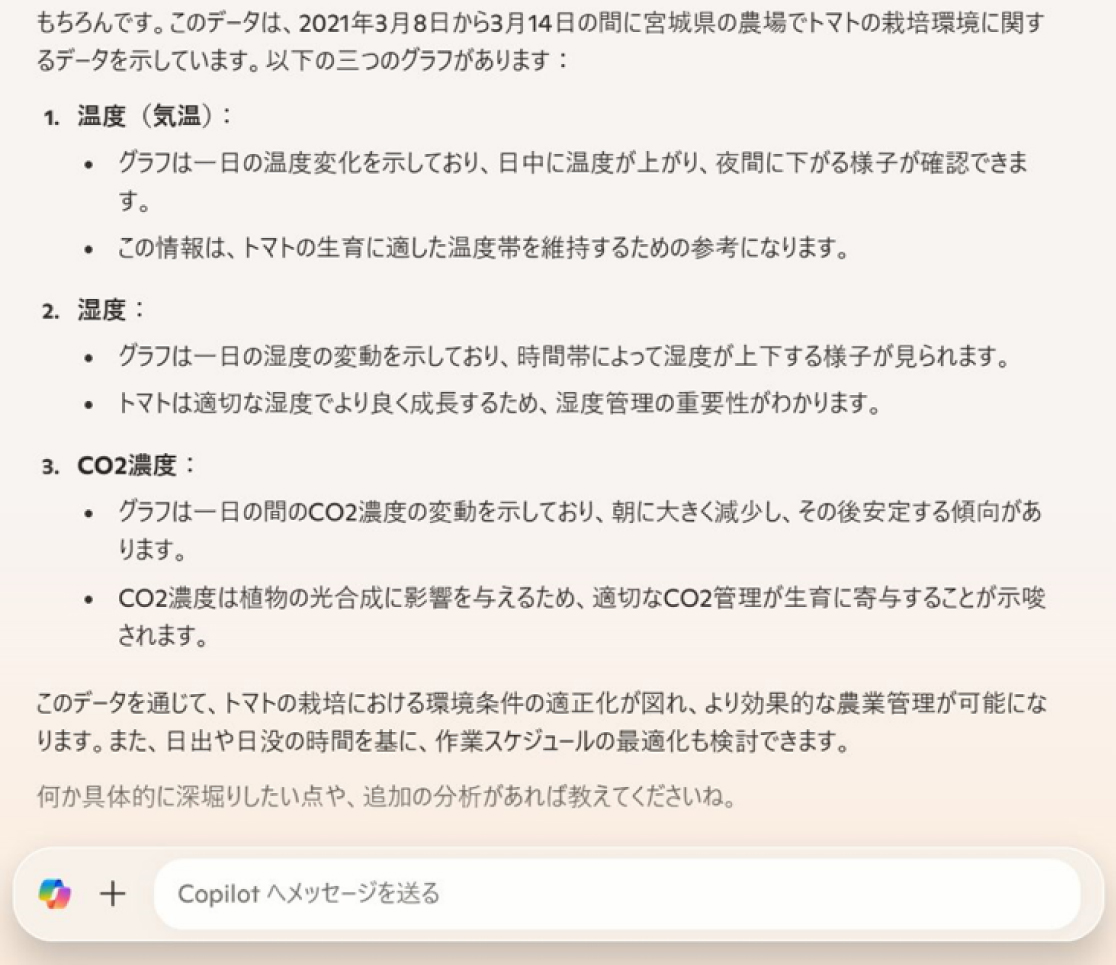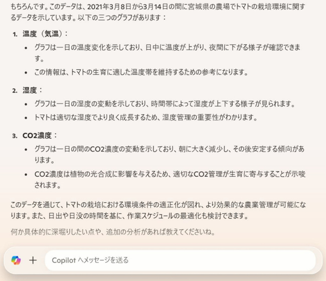 さらに、温室の気温、湿度、二酸化炭素(CO2)等の環境データの管理システムから入手できるデータを添付し、次の作業を質問すると即時に分析し、何をしたら良いかの提案まで行ってくれる。