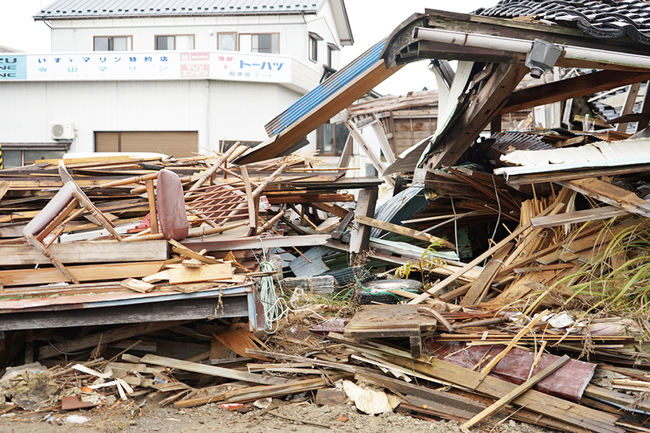 珠洲市の海岸近くの道路沿いには津波で流されたと思われる家屋の瓦礫がいまも数多く残っていた。