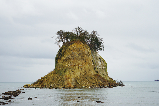 観光名所の「見附島」。「軍艦島」とも呼ばれる所以であった先端部分は地震で崩れ落ちてしまった。
