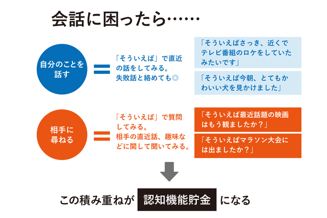 仕事中に限らず、自宅マンションの前でご近所さんと一緒になるなど、プライベートでも起こり得るシチュエーションです。短い時間の中で脳をフル回転させるチャンスと捉えて楽しむか、何もしないか。たったこれだけのことですが、将来の脳の認知機能に差が出る可能性が高まります。