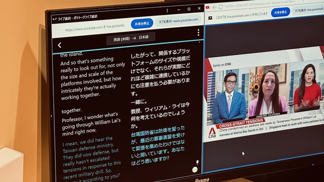 次は、ポケトークライブ通訳。セミナーなどで一方的に話すことを、対訳形式で通訳してくれる。同時なので精度は落ちるが、それでも95%以上の正確さを誇るという。こちらはPCなどを使うので、機材によっては、より認識率が落ちるかもしれない。専用ハードはそれだけの価値を持つのだ。