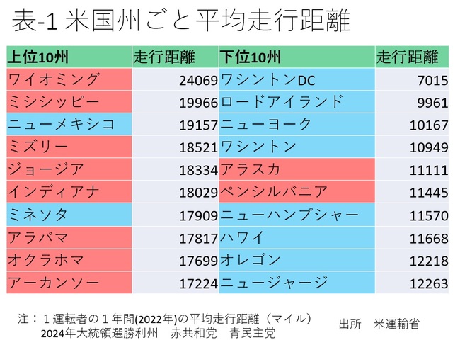 一方、走行距離が少ない州は民主党地盤の州が多い。民主党支持者が都市部に多く、通勤距離が短い、あるいは公共交通機関を利用していることがあるだろう(表-1)。