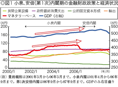 図1は、小泉政権・第1次安倍政権下でのマネタリーベース(季節調整値)、GDP、政府最終消費支出、公的固定資本形成(公共投資)、民間企業設備投資、輸出(いずれも実質の季節調整値)を示したものである。