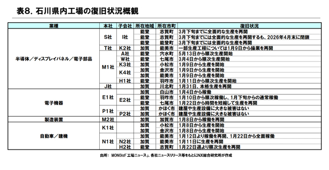 食品工場以外の石川県内の工場の被害状況については、筆者の知る限り、中央官庁や自治体による公表は行われていないが、報道情報や各メーカーのニュースリリースをもとに筆者が取りまとめた下の表8.をご覧頂きたい。