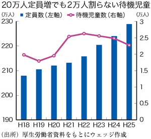保育所待機児童数は、13年4月時点で2万3000人弱と、依然都市部を中心に深刻な状況が続く(図)。政府の定義では、自治体が独自基準で運営する保育所(都の認証保育所など)の児童や、入れる保育所があるのに待機している場合は待機児童に含めない。埼玉県の主婦は、斡旋された保育所が遠いからと断ったら、待機児童から外された。「数を減らすために、通えない所を紹介しているのでは」。潜在待機児童数は85万人超とする厚生労働省の推計もある。