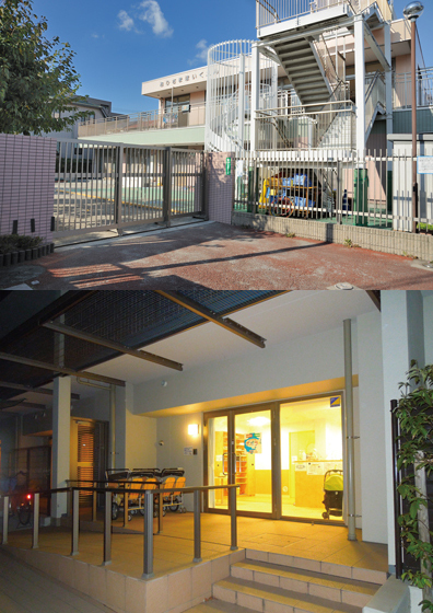 写真上・設備が充実しており、園庭も広い認可保育所 。 写真下・敷地は狭いが夜遅くまで開いている認可外保育所