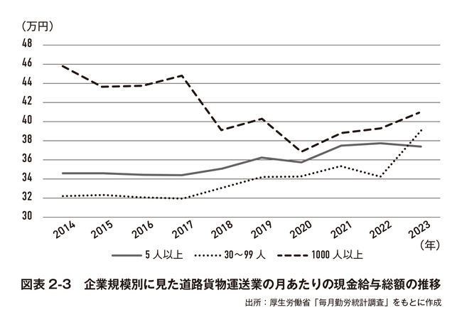 他方、道路貨物運送業の大企業では労働時間の短縮が進んだ時期から賃金が下落してきた(図表2-3)。大企業で労働時間の短縮が始まった年を2018年と想定し、その前年である2017年と2023年を比較すると、現金給与総額は、産業平均(5人以上規模)で8.7%増だったのに対し、大企業では8.6%減となった。ただし、大企業の賃金は、2020年に底をうち、2021年からは反転している。