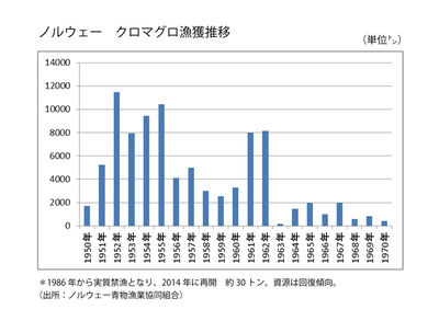 過去のノルウェーのクロマグロの漁獲推移をみると参考になります。ノルウェーでは1950~1960年にかけて多い時には年間で8,000~10,000トンものクロマグロを漁獲していたのです。しかし、乱獲がたたり水揚げは減少。1986年からは禁漁しています。その原因として①餌のニシンが減少した(これも乱獲が原因。漁船を減少させ、かつ資源管理を実施)②漁業機器と技術が発達した③ノルウェーに回遊する前に漁獲されてしまった等が考えられるそうです。