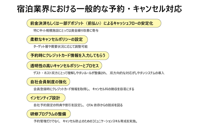 民泊では、大手のAirbnb(エアビーアンドビー)がゲストに予約時のクレジットカード全額前払いを導入しており、ノーショー問題は極めて少ないという。宿泊後24時間以内にゲストやホストから特段の申し出がなければ、ホストの口座に即時入金される仕組みが整っており、これによりノーショーによる取り損ねが原則発生しない。