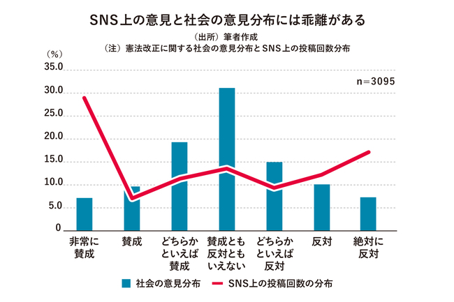 また、SNSは極端な意見が発信されやすいというバイアスもある。SNSは能動的な言論空間であり、言いたいことのある強い思いを持った人が大量に発信することが可能で、それを止めるモデレーターもいない。中庸な意見の人は発信するインセンティブが小さいうえ、いざ発信すると極端な人に攻撃されるため、発信の萎縮も起こりやすい。その結果、「サイレントマジョリティー」の意見を埋没させている。