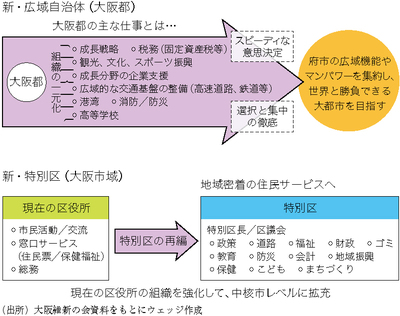 現在の議論では、最終的に区割りが5区になるか7区になるかは別として、特別区には中核市並みの権限が与えられるという。区長は公選で決め、区議会も設置。区ごとにマニフェストを作成するなど、地域に密着した住民サービスが提供できると大阪維新の会は説明する。