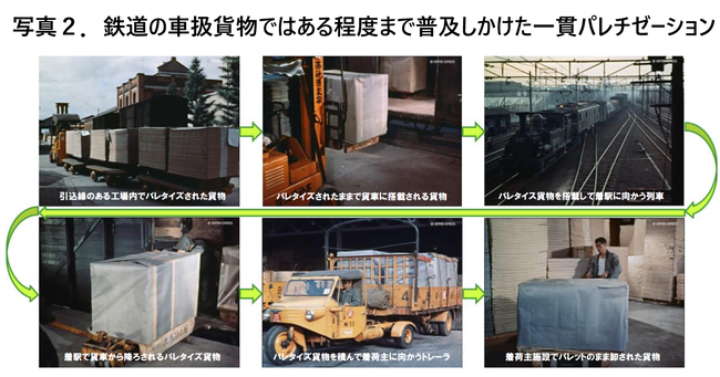 現在の鉄道貨物輸送は、貨物に合わせた専用貨車1両単位で貸し切って直接積載する「車扱(しゃあつかい)輸送」と、貨物を荷送人の戸前でコンテナに入れてトラックが発側貨物駅まで、同駅から着側貨物駅までを鉄道が担い、荷受人戸前までの配達をトラックで行う「コンテナ輸送」に分けられる。写真2が示す通り、当時は従来型の貨車を用いた車扱輸送でも、一貫パレチゼーションが品目によっては一定のレベルまで進んでいたのである。