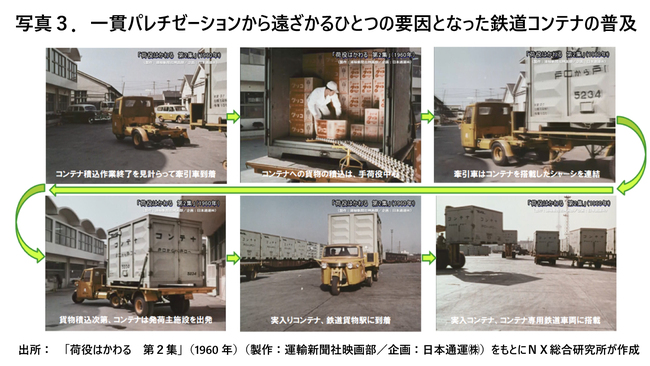 下の写真3は、60年前後の国鉄の5トンコンテナの引取から鉄道貨物駅までの輸送行程のスナップショットである。貨物のコンテナへの積み込みはパレットを用いない手荷役で行われている。