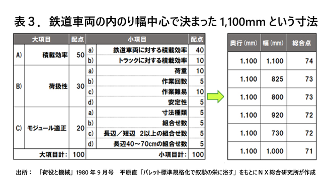 この当時は国鉄の車扱輸送が中心的輸送モードであったため、鉄道車両の内法幅(うちのりはば)である2300mmにパレットが2枚収まるよう、奥行きが1100mmの11型パレットが生まれたというのが実態であろう。