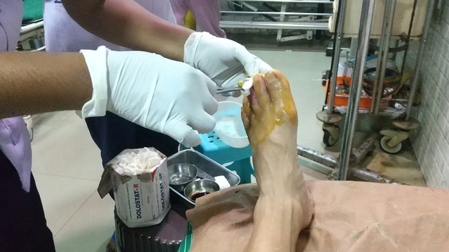 ほどなく名前を呼ばれ治療室へ。すぐに女性医師が来て予診記録を見ながら簡単な質問をして処方箋作成。女性医師がナースに指示すると、ナースは左足指を手際よく消毒して患部に塗り薬をつけた。ナースは「靴下を履かずサンダルで歩くこと、清潔に保ち1日数回洗うこと、塗り薬は1日2回、飲み薬は日数分を飲み切ること」など注意事項をご託宣。薬局で薬代1200円払い軟膏1本、飲み薬5種類を受け取った。小一時間で終わったので日本の総合病院よりは早い。