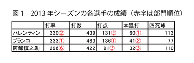 まずは、昨年のセ・リーグ打撃上位の成績を見て欲しい。バレンティン、ブランコ(横浜DeNAベイスターズ)、阿部慎之助(読売ジャイアンツ)。バレンティンの本塁打数は群を抜くが、ブランコもけっして劣らない。阿部も健闘しているが、数字上はやはり見劣りする。