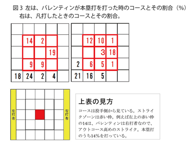 一方、図4はブランコ。アウトローが強いところはバレンティンと似ているが、高めと真ん中低めが弱い。高低差を使えば打ち取れる可能性があることを示す。