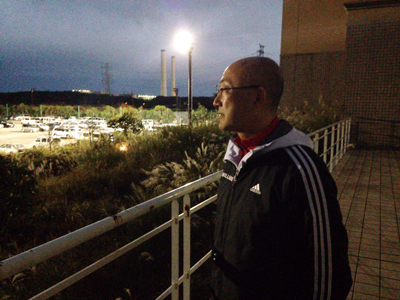 正面。そこにもう、芝はない。視野一杯に広がる11区画のグラウンドは、むきだしの土にアスファルトや砂利が撒かれ、膨大な数の車両が停められている。鉄板が敷かれ、資材置き場と化したグラウンドも見える。フェンスにかかる横断幕が、わずかにサッカー場の面影を残すのみ。ちょうど勤務の交代時間だったのか、車の出入りがせわしない。
