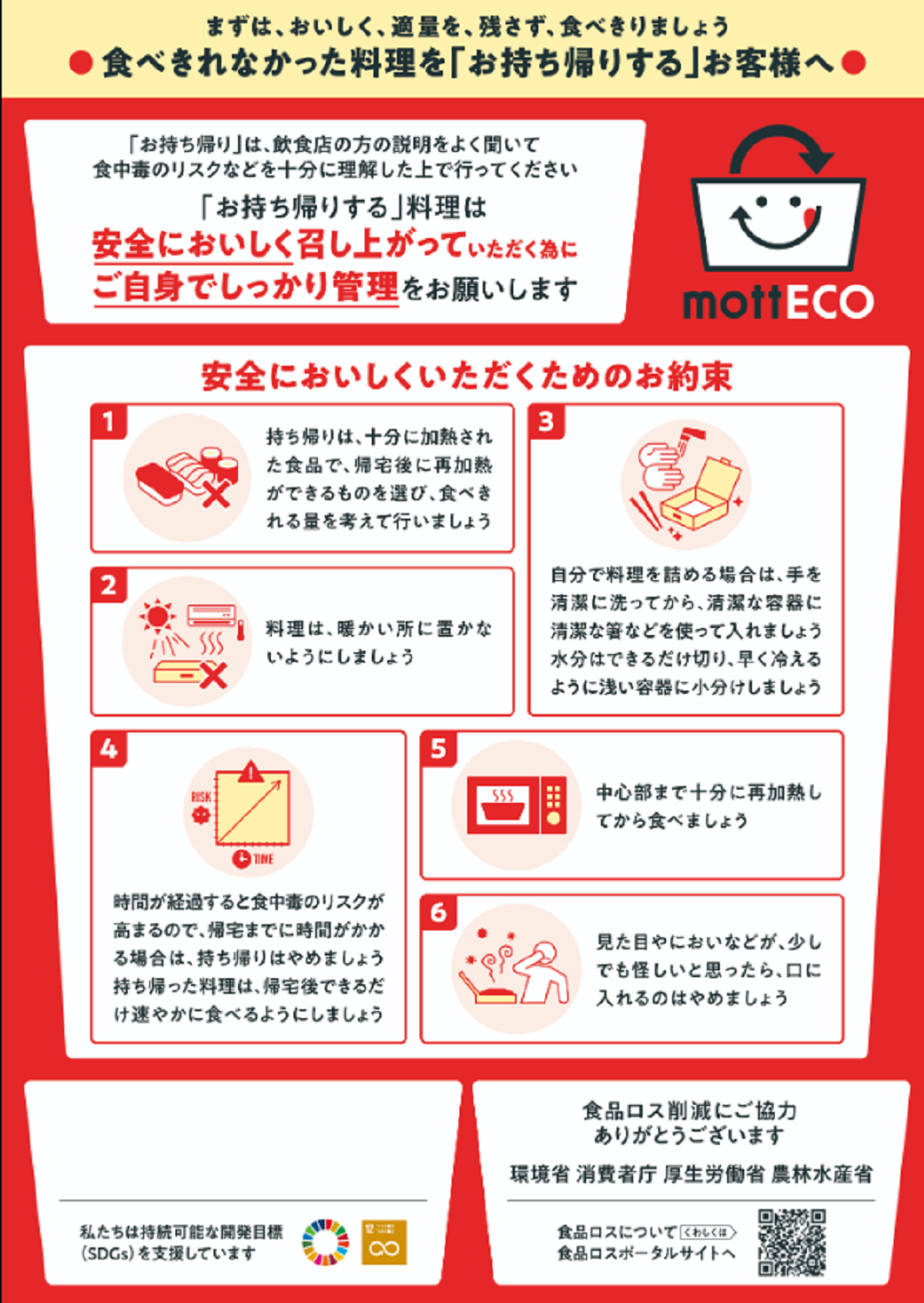 持ち帰り時の食品管理の責任の所在を明確にするため、デニーズや名鉄グランドホテルをはじめ外食やホテル、中食、自治体、大学の21企業・団体で構成される「mottECO普及コンソーシアム」では、事業者向け、客向けの説明資料を作成している。ことに、責任問題がわかりやすく説明されている客への説明資料は、飲食店の現場ではとても便利だそうだ。