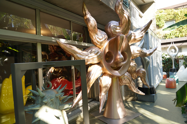 アトリエを離れて前庭に出てみた。岡本が愛した芭蕉の木が幾本も生い繁り、その葉陰に隠れるように立体造形「若い太陽」や「動物」などがあちらこちら、無造作に置かれている。この芸術家の内面を思わせるナチュラルかつ奔放な庭である。