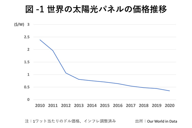 なぜなら、設備の価格が習熟曲線と規模の経済により、毎年下落することが確実だったからだ。実際に太陽光パネルの価格は図-1の通り推移している。