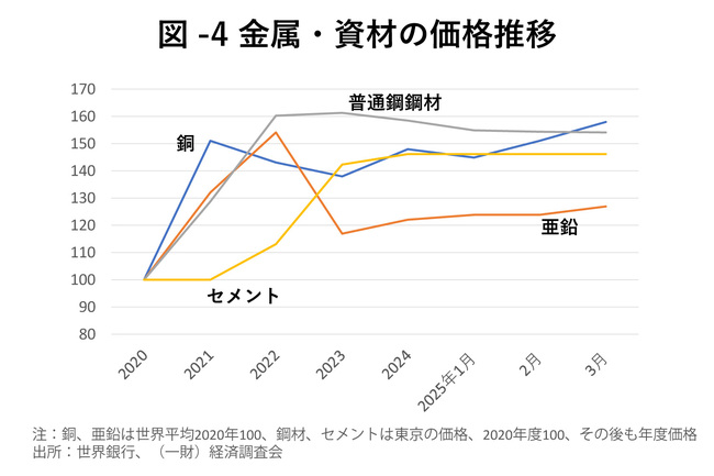 図-4が風力設備で大量に必要とされる銅、亜鉛の世界市場での価格推移と東京でのセメントと普通鋼鋼材価格の推移を示している。