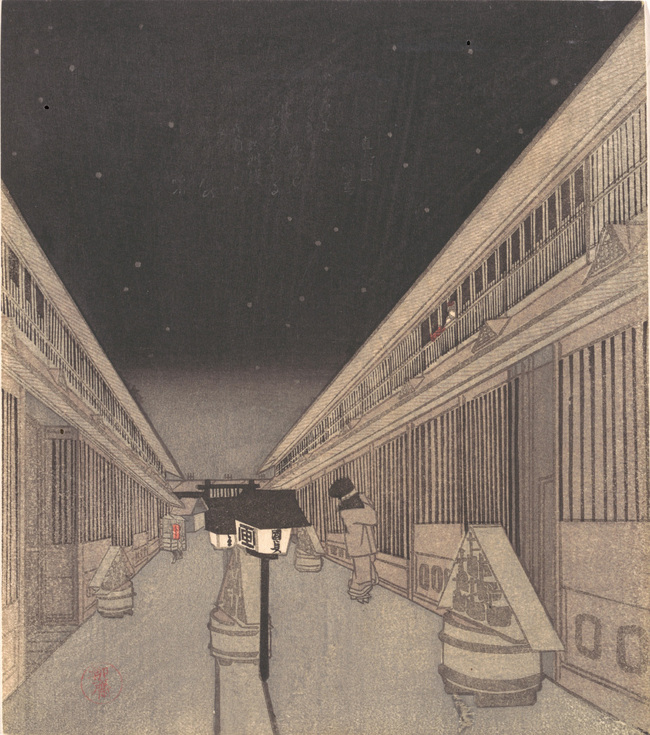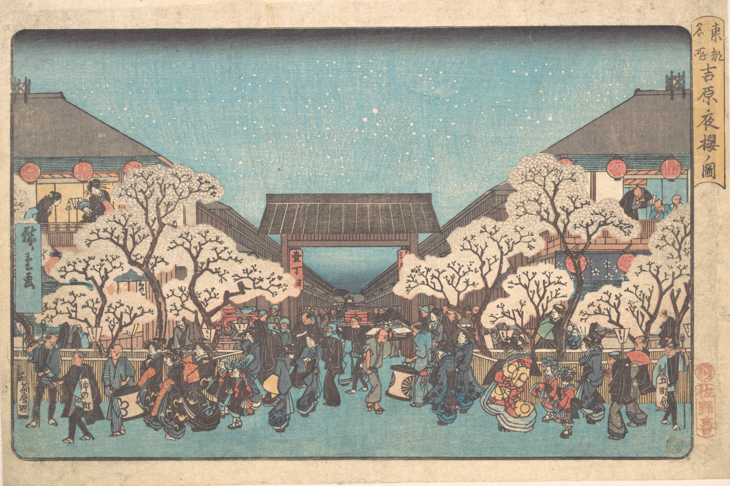 この五十間道を進んで大門をくぐれば吉原の廓の内だ。重三郎が育った引手茶屋の蔦屋(ドラマでは大店(おおだな)の駿河屋に換えられている)は廓の中心をまっすぐ縦に走る「仲ノ町」沿いにあった。この南北の筋は「待合ノ辻」とも呼ばれ、呼び出された高級遊女が客の待つ茶屋に赴く「花魁道中」の舞台としても利用された。夜中になってもこの仲ノ町で遊女と客が忍び会う事もあり、まさに待合ノ辻の本領発揮。その情景が歌川国貞の浮世絵「夜の吉原」(ボストン美術館所蔵)にも描かれている。