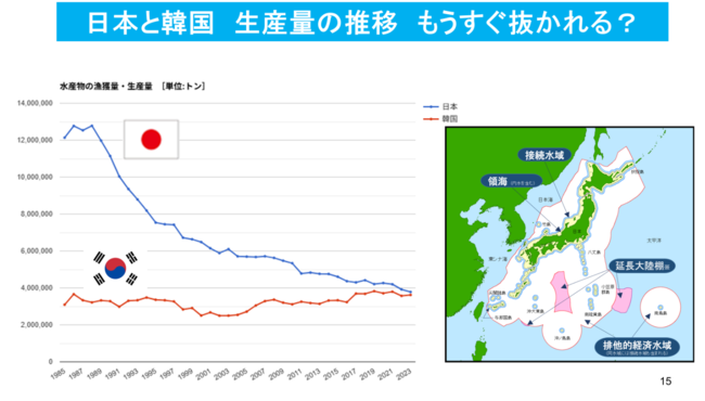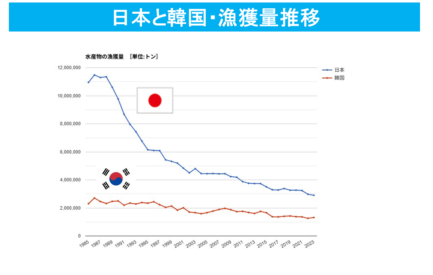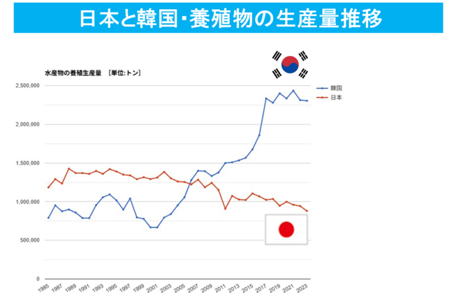 韓国との比較では、日本の生産量の減少の理由として定番のように出てくる「中国」と「海水温上昇」のせいといった言い訳は通用しにくいです。もっと根本的な国としての戦略の違いがあるのではないでしょうか?