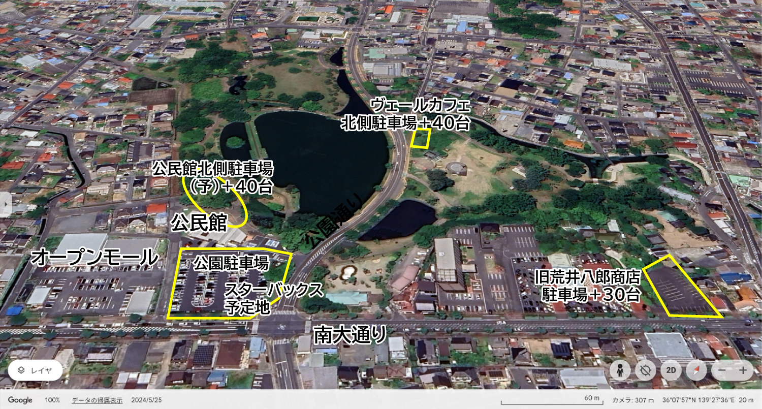 公民館利用者の駐車スペース不足と周辺道路の渋滞を懸念する声に対し、市は代替策を講じた。1つは公民館から公園通りを横断し約200メートル(m)北にある、別の公園カフェ「ヴェールカフェ」北側に今春造成した駐車場40台分、もう1つが南大通りに沿って約400m東にある旧荒井八郎商店の駐車場30台分である。旧荒井八郎商店は行田市が観光振興の一環として購入した西洋館(国登録有形文化財)だ。2つの駐車場は公民館からは離れているが、水城公園に来園する車を分散できれば公民館の混雑緩和も期待できる。