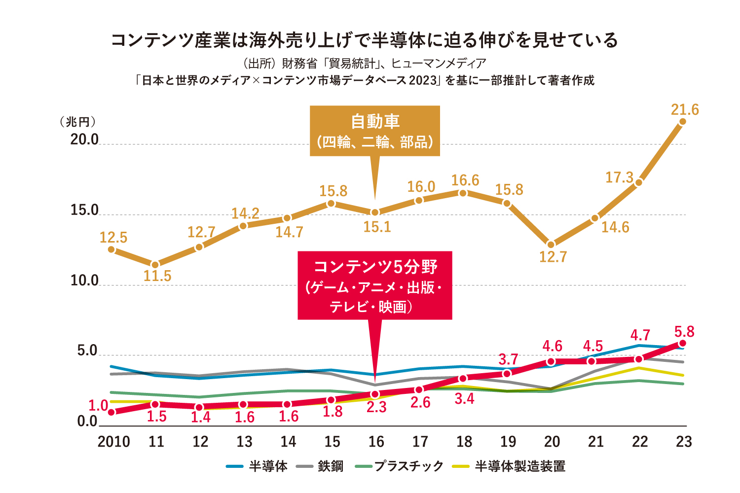 こうした世界トレンドに後押しをされるように、日本政府・行政からも〝エンタメ〟が注目を集めるようになっている。それもそのはず、(今後、「トランプ関税」の影響は避けられないが)23年の自動車関連の輸出額は約21・6兆円に達するなど、堅調な自動車産業と比べて、半導体・鉄鋼・プラスチックといった〝第2の輸出産業〟がなかなか大きく拡大しない中、コンテンツ産業はダークホースのように、10年代後半より急拡大しているからだ。